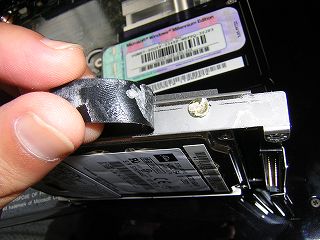 ステイからHDDを取り外さなくてはならないのだが、パッと見では固定されているビスが見あたらない。 |